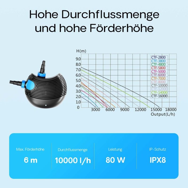 A SunSun CTF-10000 10000 l/h teljesítményű, 80 Wattos tószivattyú az egyik legnagyobb hatásfokú tó-, patak-, szűrő- és szkimmerszivattyú.